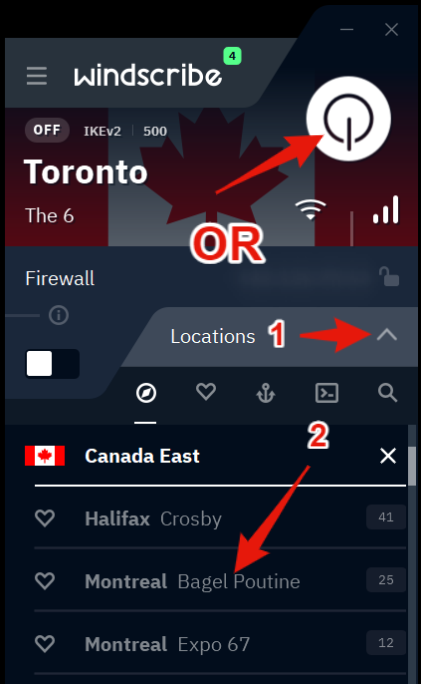 - Once logged in, you can connect by pressing the big ON button, or by expanding the location list and selecting an available location.