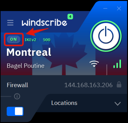 - You will know you are connected when the application turns blue and you see ON in the top-left corner. The IP address will also change from your personal IP to the VPN IP. Once you are connected, all your internet traffic on this device will go through the Windscribe servers. The websites and apps you use will see the VPN IP shown in the app instead of your own personal IP address.